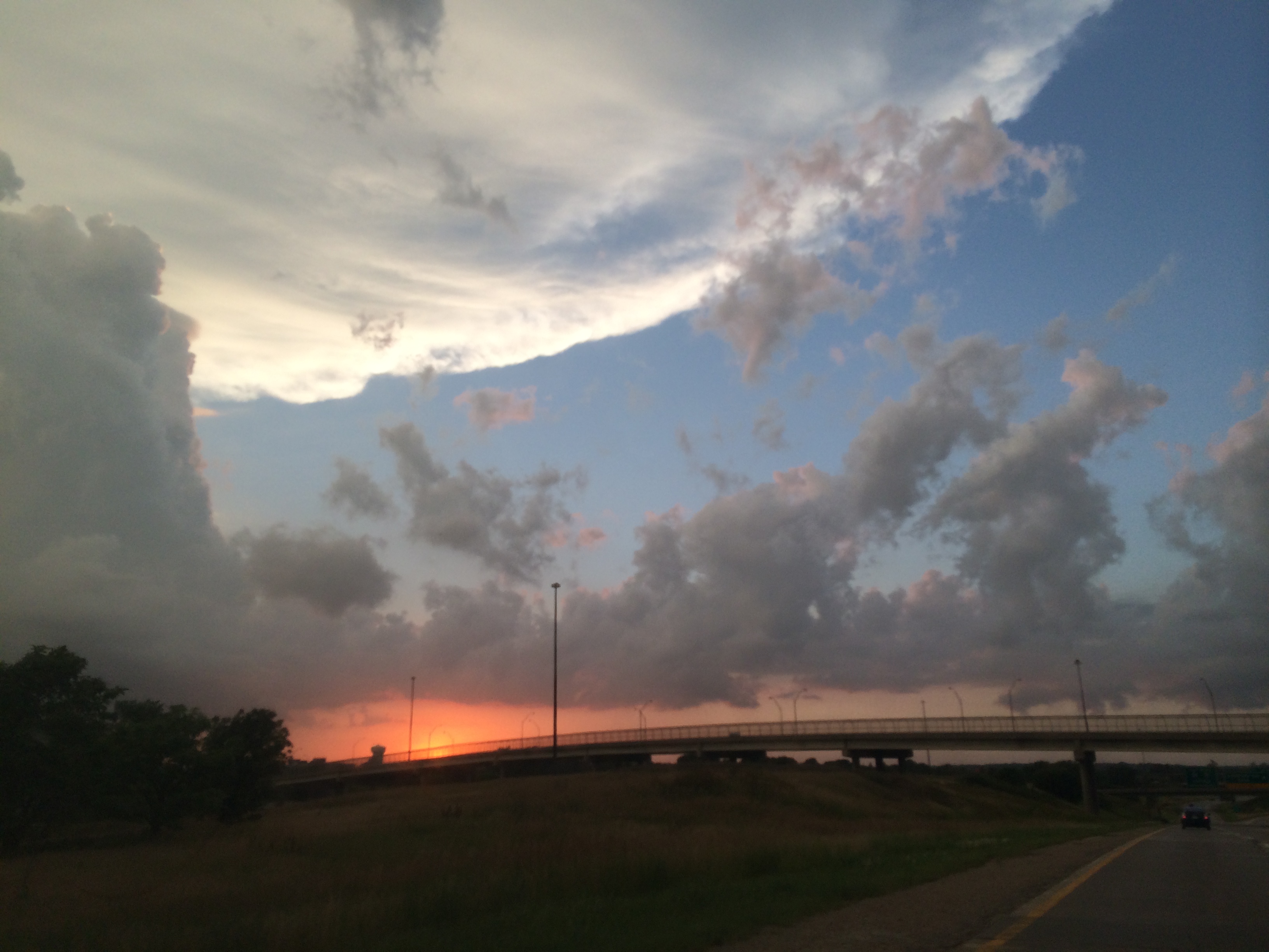 As the sun lowered in the sky, nearly half way through Iowa now, I saw a thick layer of charcoal clouds stacking up like an artist layering shades of black and gray on a sheet of paper. My eyes kept snapping back to the horizon, watching them morph. I turned to my friend Fedy; he was sitting in the passenger seat, fingers combing his brown hair into mountain peaks. “Check the radar on my phone. I don’t like those clouds.” The phone’s screen glowed in his glasses.
